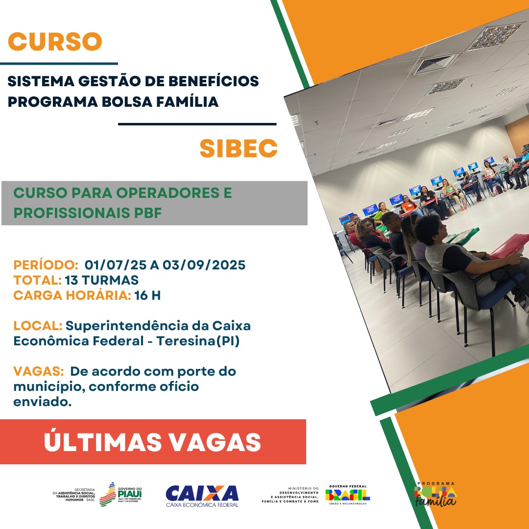 Nos dias 12 e 13 de Agosto de 2025, em Teresina/PI, foi realizado o Curso do Sistema de Gestão de Benefícios - Programa Bolsa Família (SIBEC), voltado para os operadores e profissionais do PBF.