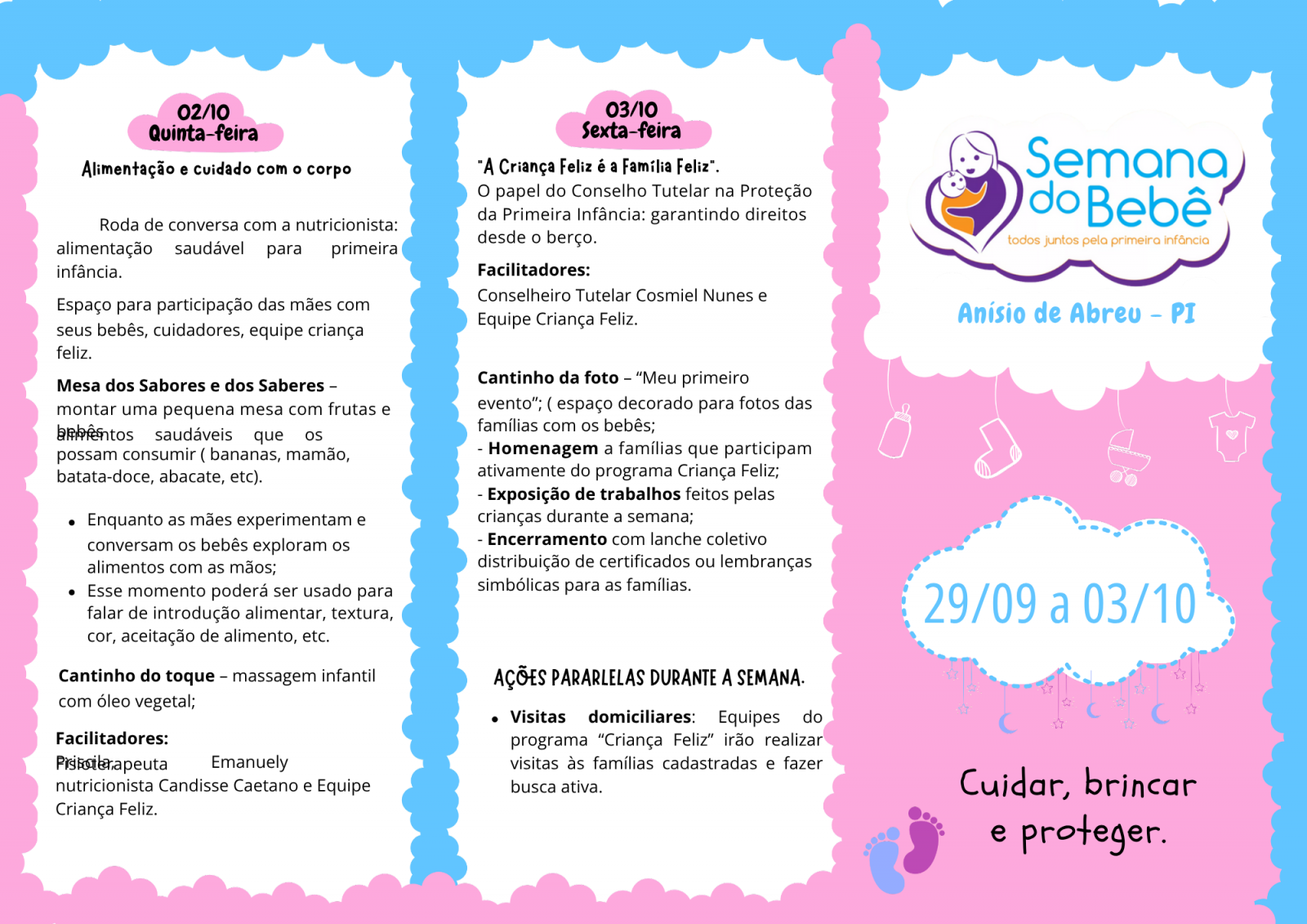 Diante disso, a Secretaria Municipal de Assistência Social, Cidadania e Trabalho (SMAS) de Anísio de Abreu divulgou o programa de tudo o que ocorrerá entre os dias 29/09/2025 e 03/10/2025, na Semana do Bebê 2025. Confira: