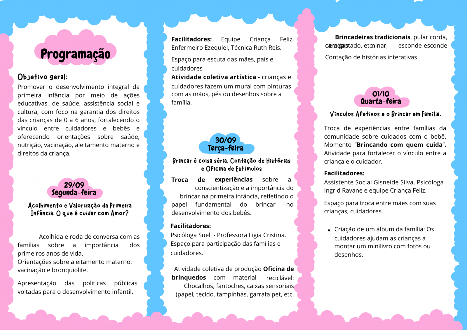 A cada edição, ocorrem discussões intersetoriais sobre temas como mortalidade infantil, aleitamento materno, nutrição, parentalidade, gravidez na adolescência, educação infantil de qualidade, formação de vínculo e estimulação do bebê, por meio da diversas atividades como palestras, oficinas, atividades lúdicas e culturais.