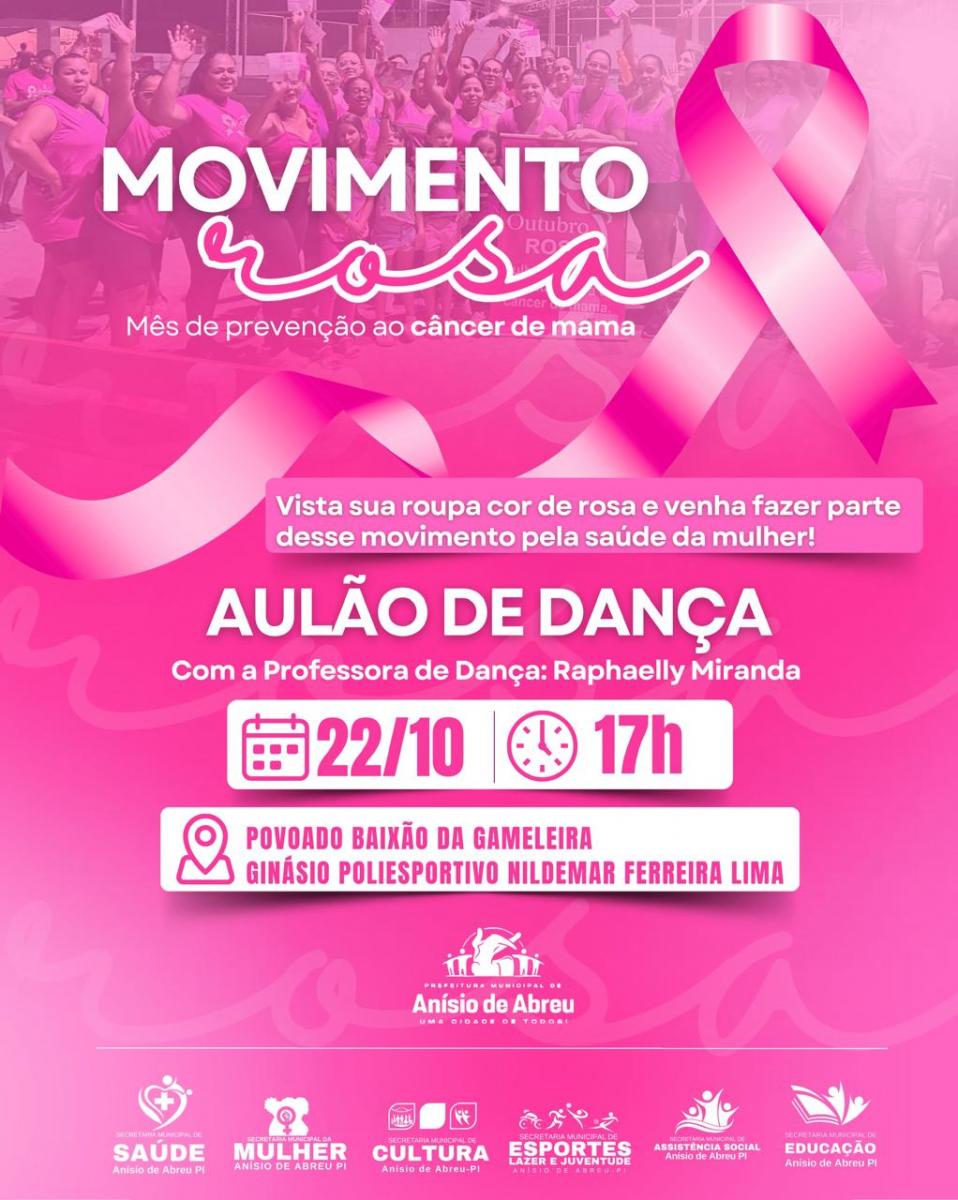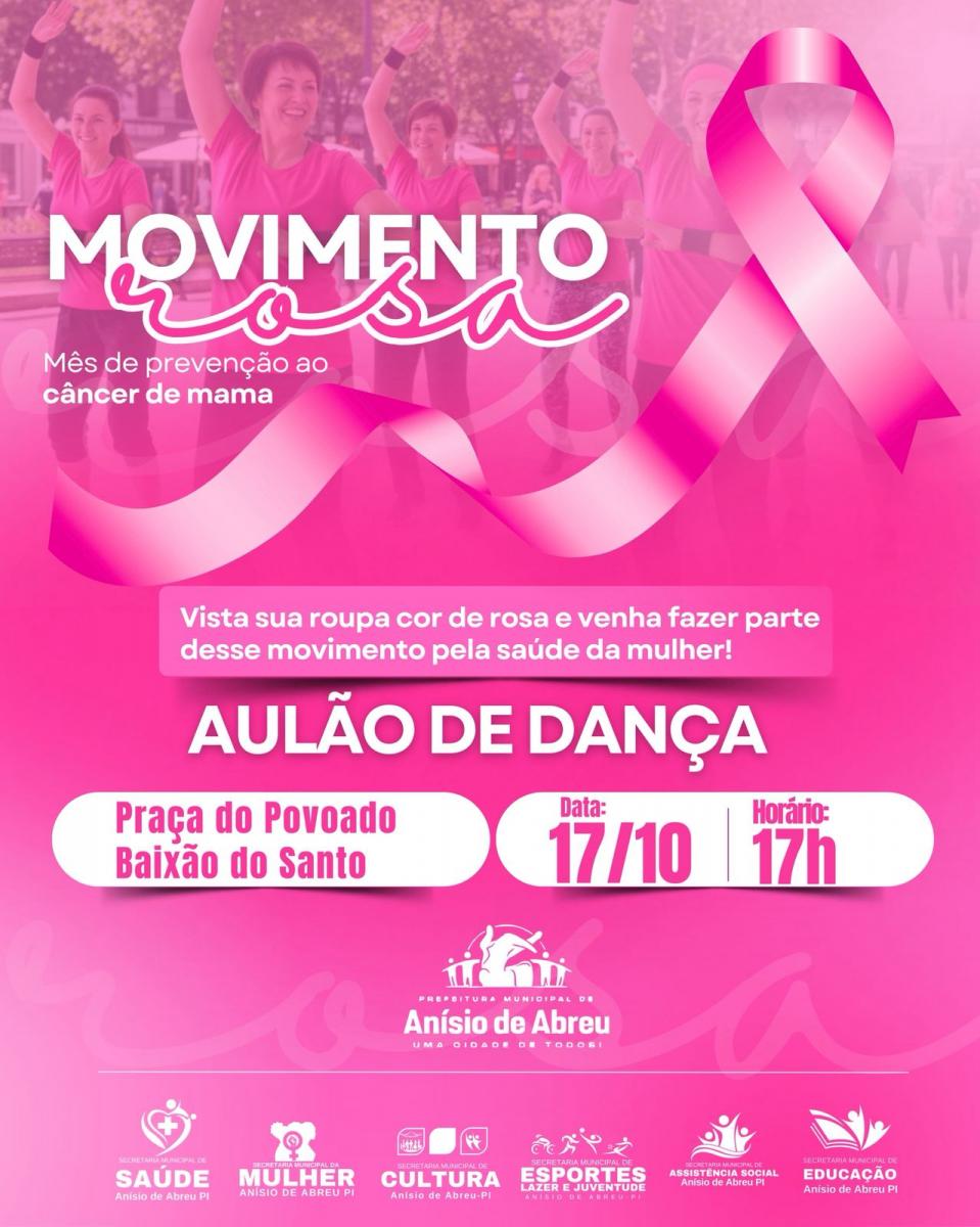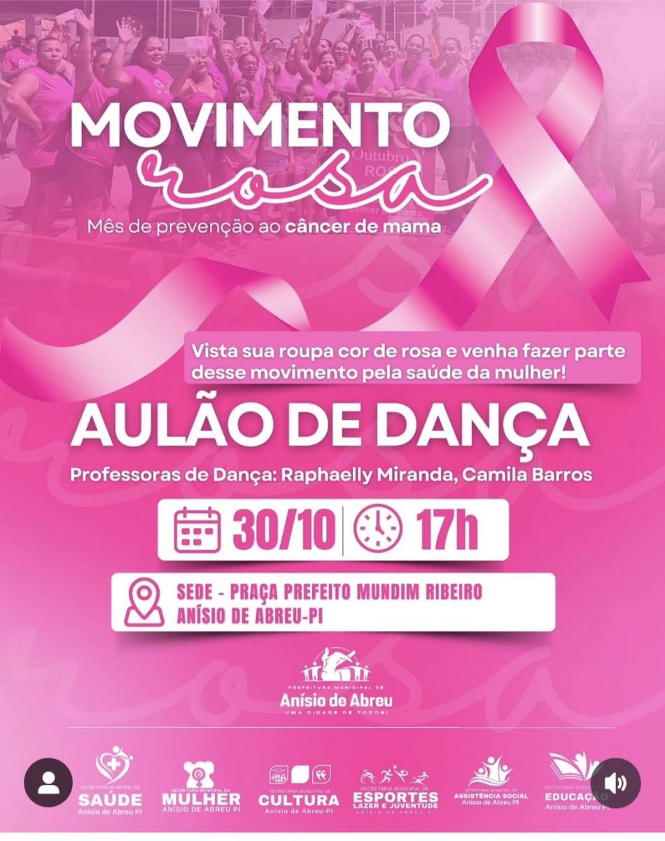 A Prefeitura de Anísio de Abreu, por meio do Gabinete da Prefeitura e das Secretarias de Saúde; Assistência Social, Cidadania e Trabalho; da Mulher; de Esporte e de Educação, promoveu aulões de dança para a comunidade em referência à campanha Outubro Rosa.
