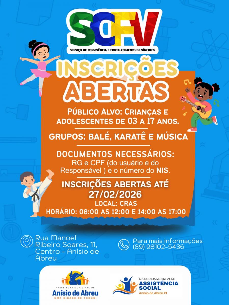 A Prefeitura Municipal de Anísio de Abreu, por meio da Secretaria Municipal de Assistência Social, informa que estão abertas as inscrições para o Serviço de Convivência e Fortalecimento de Vínculos (SCFV), destinadas a crianças e adolescentes de 3 a 17 anos.
