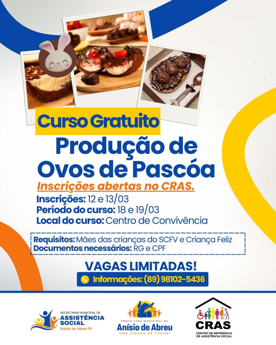 A Secretaria Municipal de Assistência Social, por meio do CRAS, está com inscrições abertas para o curso gratuito de Produção de Ovos de Páscoa. A iniciativa tem como objetivo oferecer capacitação e incentivar a geração de renda para as famílias acompanhadas pelos serviços socioassistenciais do município.